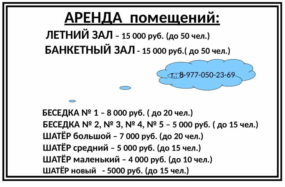 В услуги входит сервировка стола всей необходимой посудой (тарелки, приборы, стаканы, рюмки и прочее), а также уборка беседок после мероприятия.